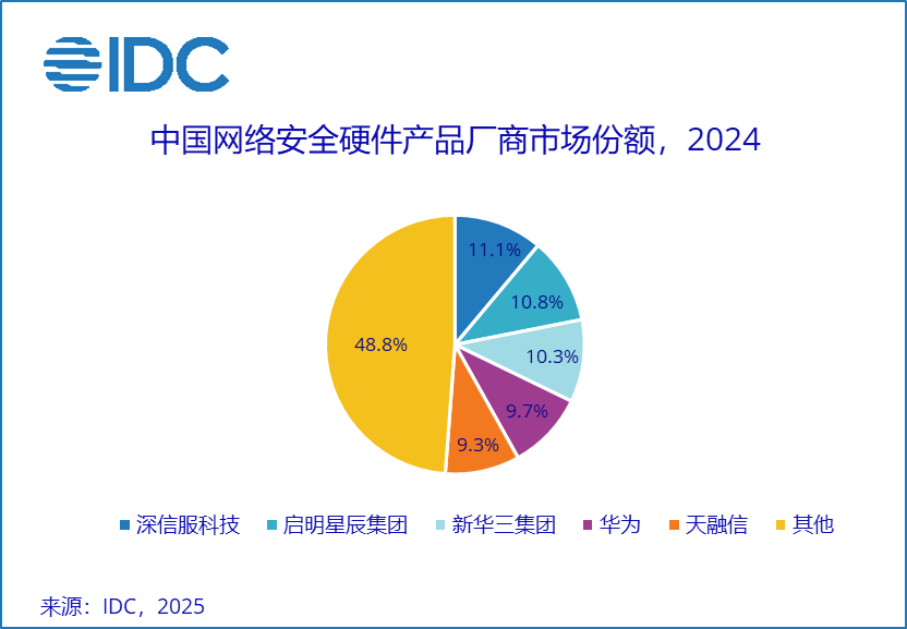 IDC发布的报告显示,2024年,中国网络安全硬件产品市场规模为210亿元人民币,规模同比减少6.5%,市场仍呈现较为低迷的态势。深信服科技、启明星辰集团、新华三集团、华为和天融信以其产品技术和市场销售等多方面优势在激烈的市场竞争中占据了主导地位。