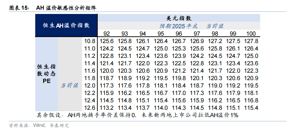 若未来美元指数回落至92左右,市场流动性水平保持不变且恒生指数估值回升至12.4以上,AH溢价可以继续走弱至15%以下。