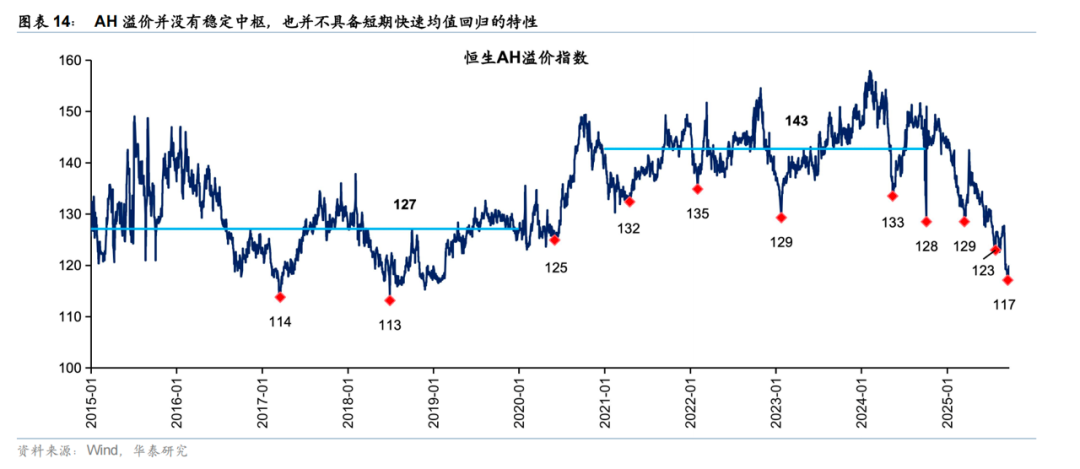 从历史数据来看,AH溢价并不具备短期快速均值回归的特性。2015年至2019年AH溢价均值为127,而2021年至2024年则跃升为143,表明其中枢水平本身就不稳定,且指标往往偏离中枢程度大、时间长。