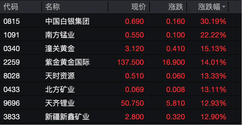 此外,有色金属板块多股暴涨。中国白银集团盘中涨超37%,收涨超30%,潼关黄金涨超15%,紫金黄金国际涨超14%。