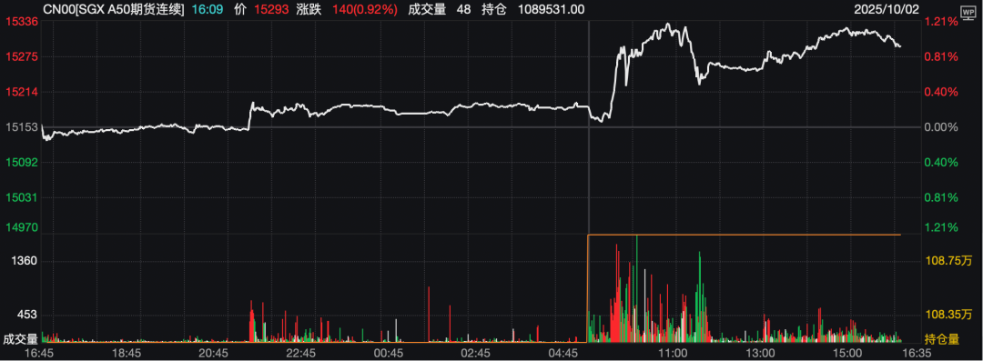而在港股开始交易后,富时中国A50指数期货盘中亦大幅拉升,最高涨超1.2%,截至发稿涨0.92%。