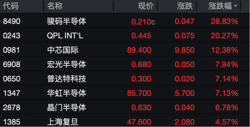 具体板块方面,半导体表现强势,Wind香港半导体指数一度涨超10%。板块内个股中,骏码半导体涨近30%,中芯国际涨超12%,宏光半导体、华虹半导体等涨超7%,晶门半导体涨超6%,上海复旦、英诺赛科涨超4%。