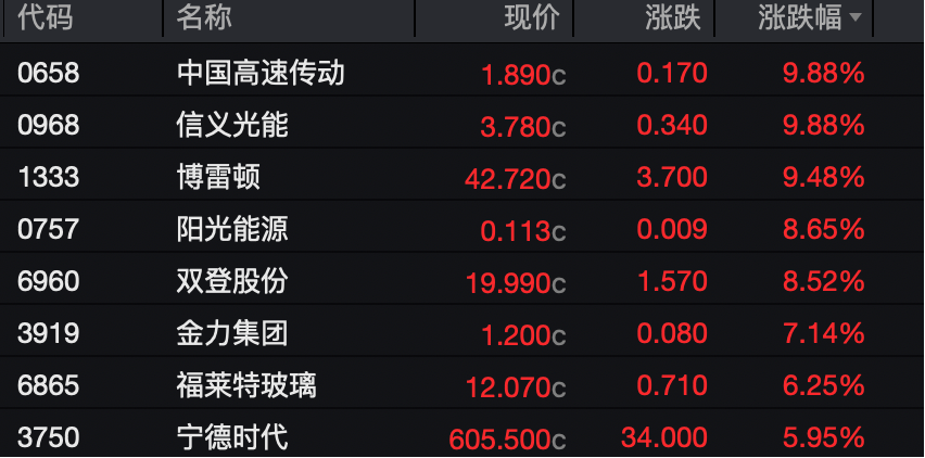 电气设备板块亦涨势强劲,板块内个股中,信义光能、中国高速传动、博雷顿涨超9%,阳光能源涨超8%。