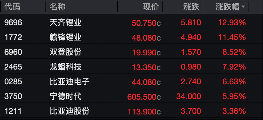 此外,港股锂电股持续走强,天齐锂业盘中涨超15%,赣锋锂业盘中涨超12%,截至收盘分别涨超12%、11%。此外,双登股份涨超8%,龙蟠科技涨超7%,比亚迪电子涨超6%,宁德时代涨超5%。