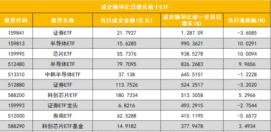 从成交额增长比例来看,10月9日多只券商和半导体ETF成交额大增。其中,证券ETF成交额环比增长超12倍居首位,半导体ETF成交额环比增长近10倍位居第二。
