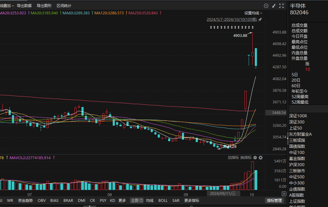 增量资金入场推动半导体板块涨势上涨,10月8日—9日,东财半导体指数涨幅高达17%。