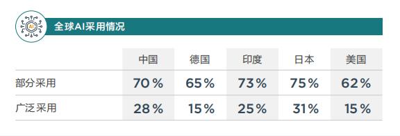 报告显示,AI已在全球企业中被普遍使用,但不同国家AI采用率存在差异。在中国,60%的企业已经使用AI超过三年,是全球平均值的1.5倍,美国的6.7倍。