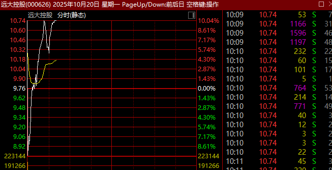 个股方面,远大控股(000626)盘中大幅波动,上演“天地天板”,现报10.25元,成交额超8亿元。该股此前走出4连板,今早以涨停开盘,随后快速跳水一度触及跌停。