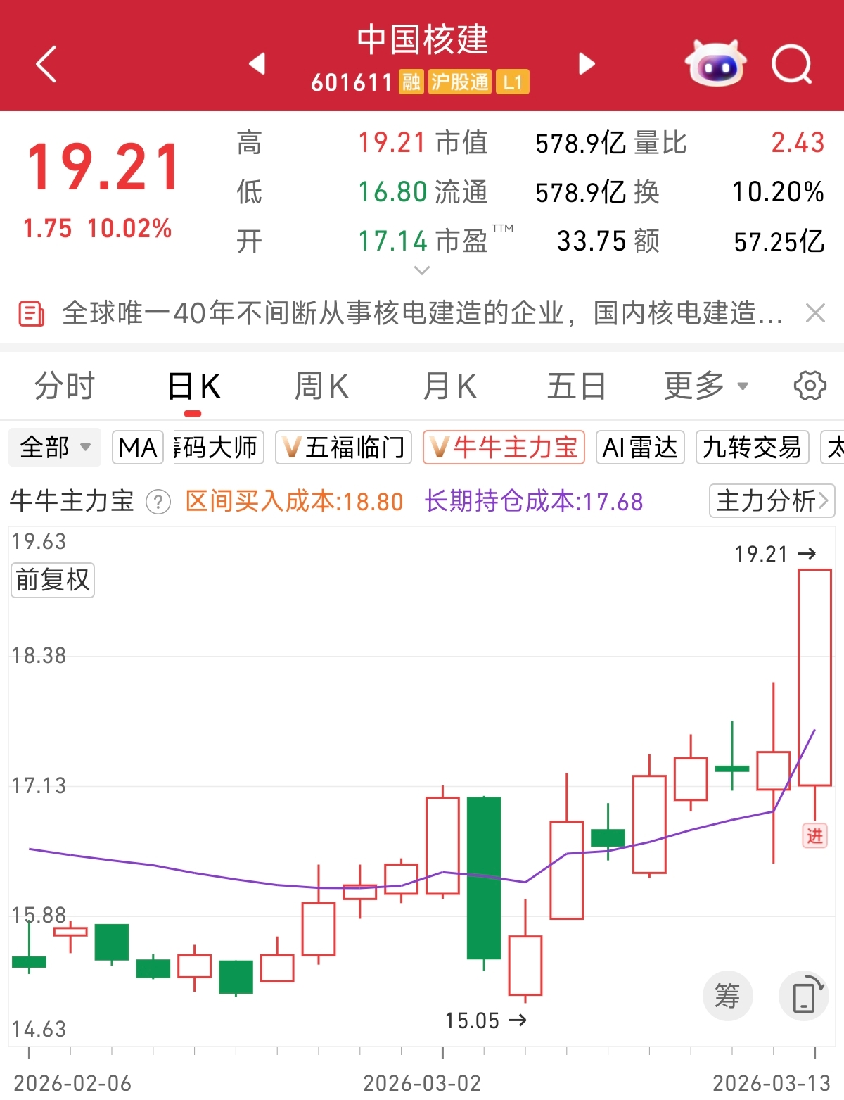 根据主力宝监控,今日大涨的海风龙头中国核建,在3月13日出现主力进场信号,感兴趣的朋友可以自行跟踪判断。