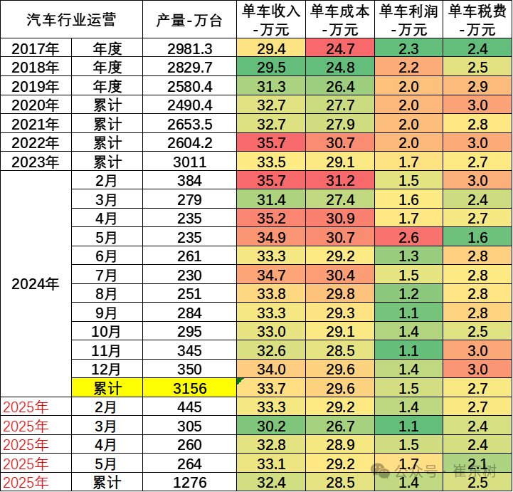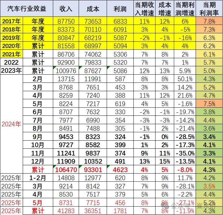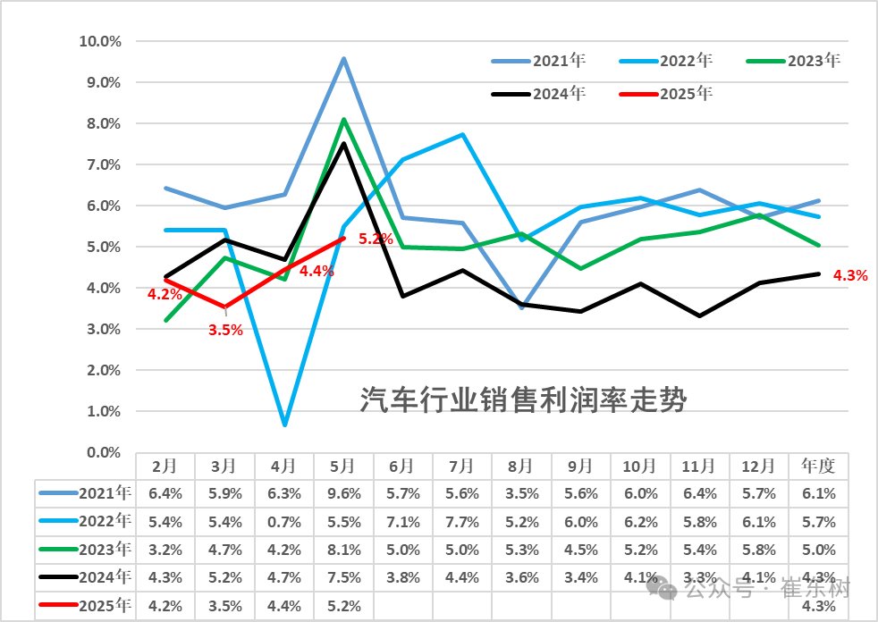 乘联分会秘书长崔东树发文称,在汽车置换更新补贴政策带动下,2025年汽车生产1276万台,同比增11%;2025年1-5月的汽车行业收入41283亿元,同比增7%;成本36351亿元,增8%;利润1781亿元,同比下降11.9%;汽车行业利润率4.3%,相对于下游工业企业利润率5.7%的平均水平,汽车行业仍偏低,但较1-4月的4.1%利润率有所改善。