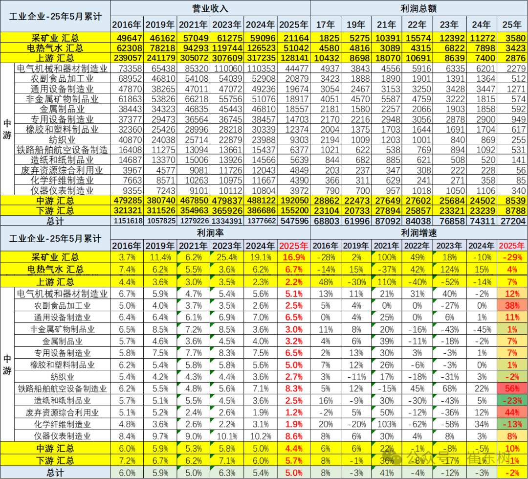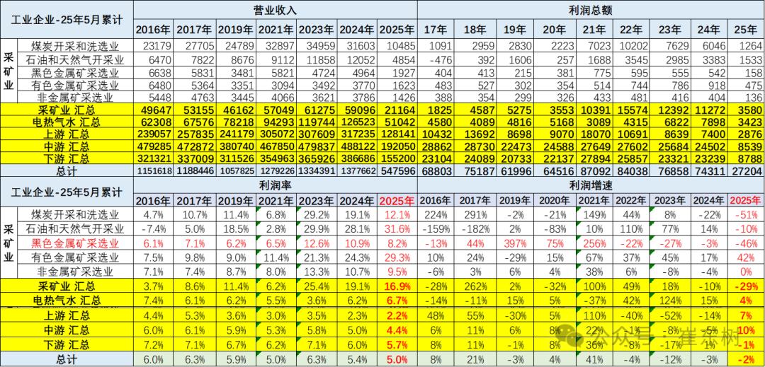 2025年1-5月的高基数和价格走低下,采矿利润下降29%仍有很好利润,采矿业1-5月利润率在16.9%水平也是很好的。