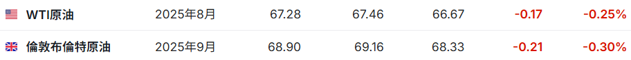 3. 截至发稿,WTI原油跌0.25%,报67.28美元/桶。布伦特原油跌0.30%,报68.90美元/桶。