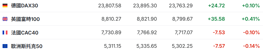 2. 截至发稿,德国DAX指数涨0.10%,英国富时100指数涨0.41%,法国CAC40指数跌0.10%,欧洲斯托克50指数跌0.14%。