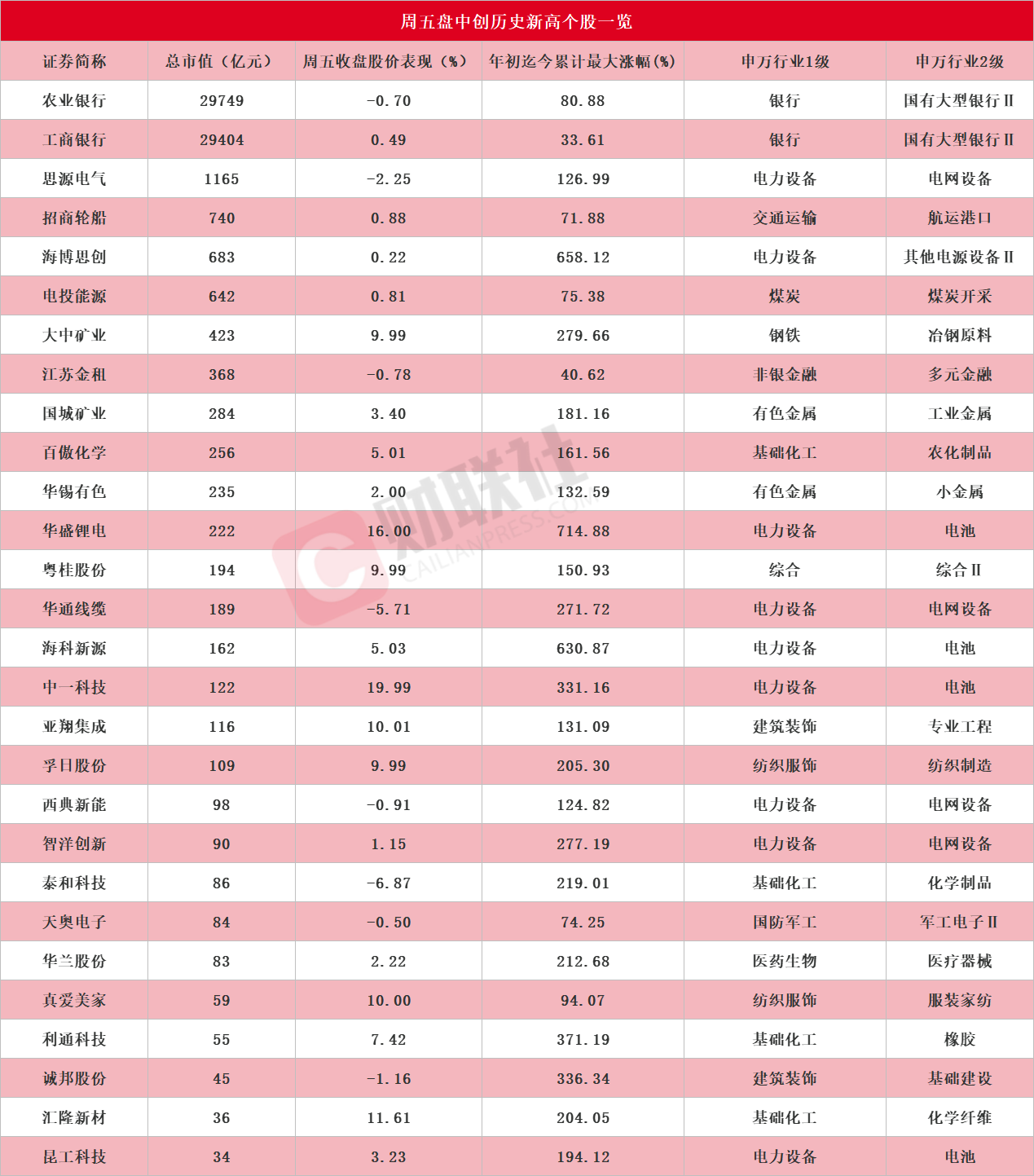 据Choice数据统计显示,剔除新股和次新股,包括农业银行、工商银行、思源电气、招商轮船、海博思创、电投能源、大中矿业、江苏金租、国城矿业、百傲化学、华锡有色、华盛锂电、粤桂股份、华通线缆、海科新源、中一科技、亚翔集成、孚日股份、西典新能、智洋创新、泰和科技、天奥电子、华兰股份、真爱美家、利通科技、诚邦股份、汇隆新材、昆工科技在内的28家A股上市公司周五盘中创出历史新高(前复权),具体详见下图: