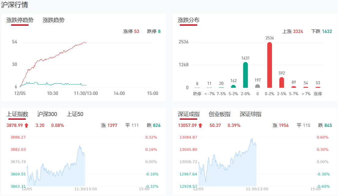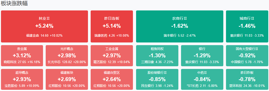 市场早盘探底回升,三大指数集体翻红。沪深两市半日成交额9927亿,较上个交易日缩量394亿。盘面上热点快速轮动,全市场超3500只个股上涨。从板块来看,福建板块持续爆发,海欣食品8天7板,安记食品、太阳电缆双双4连板,舒华体育2连板。算力硬件概念快速走强,长光华芯20cm涨停创历史新高。商业航天概念股延续强势,顺灏股份6天5板,龙洲股份3连板。人形机器人概念表现活跃,骏亚科技3连板,中坚科技涨停。下跌方面,银行板块震荡走弱,重庆银行跌超3%。