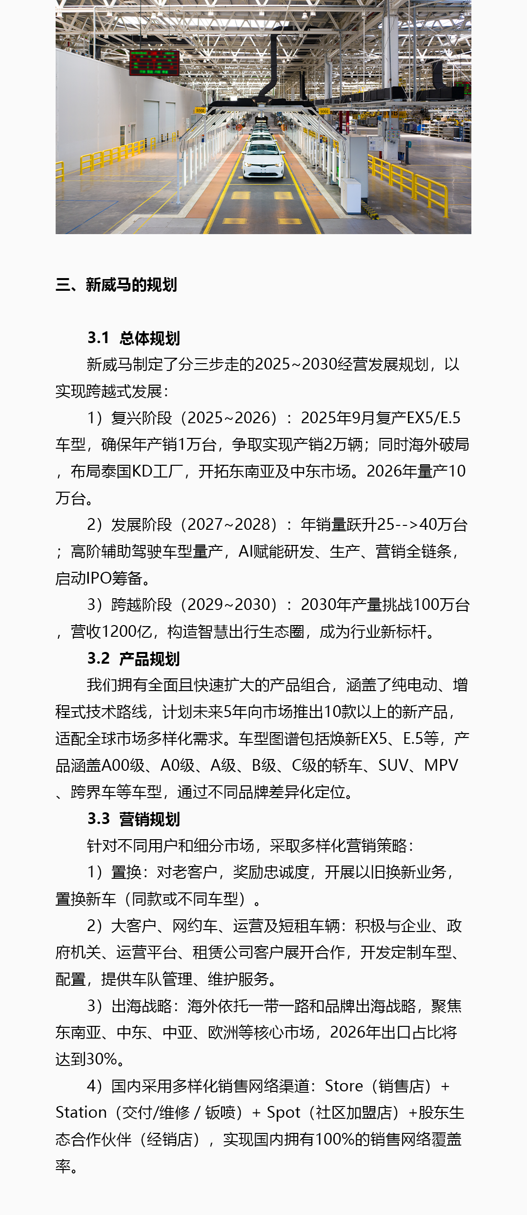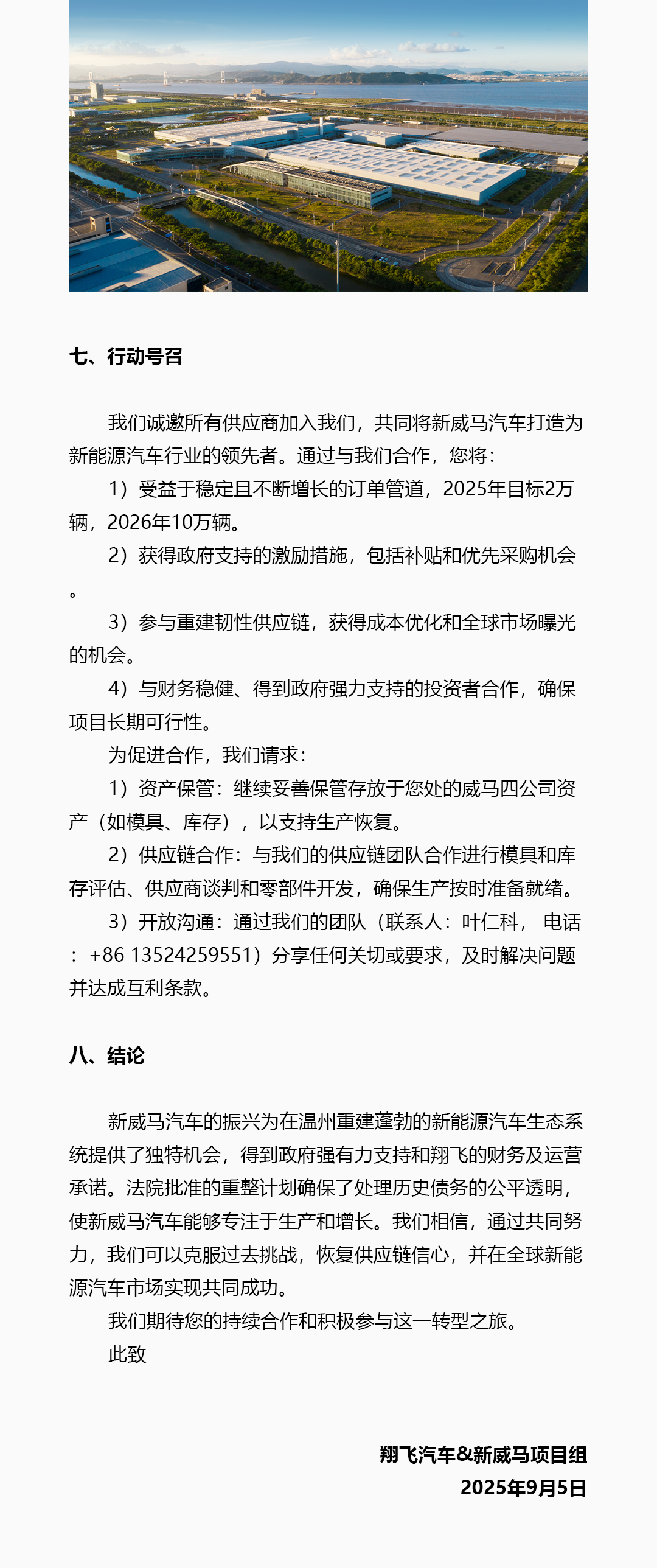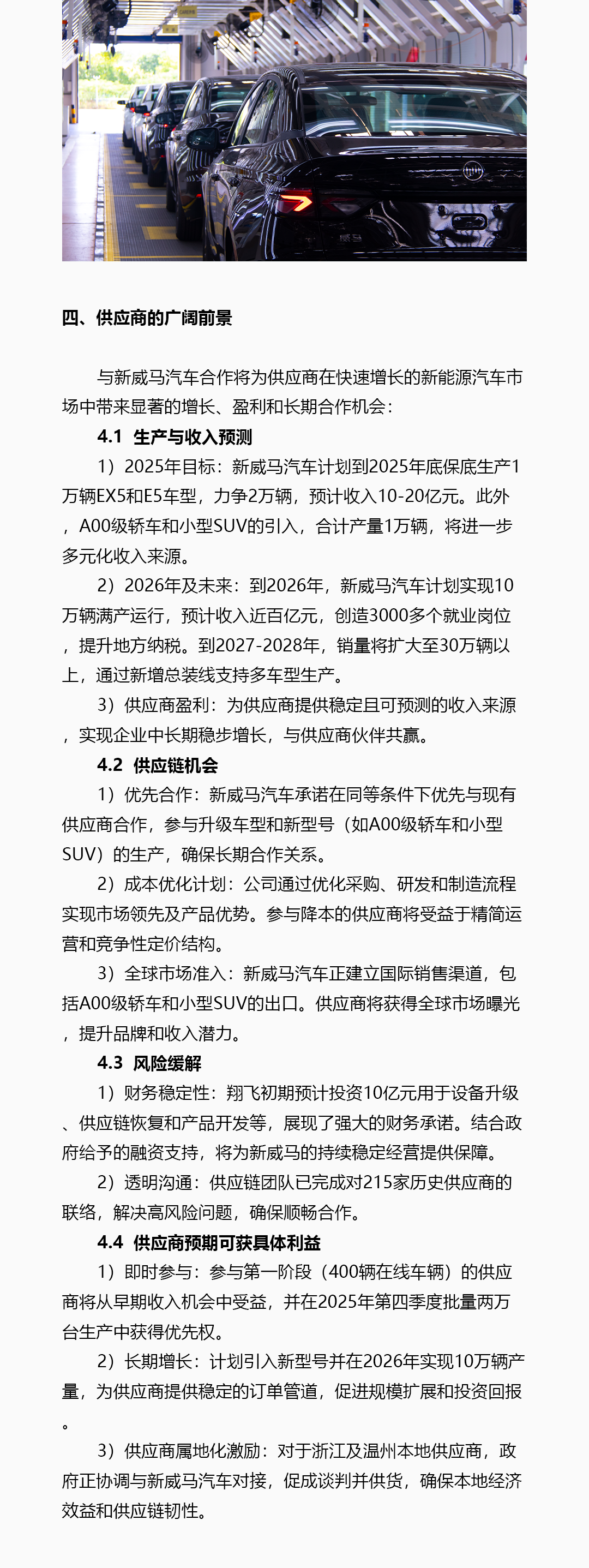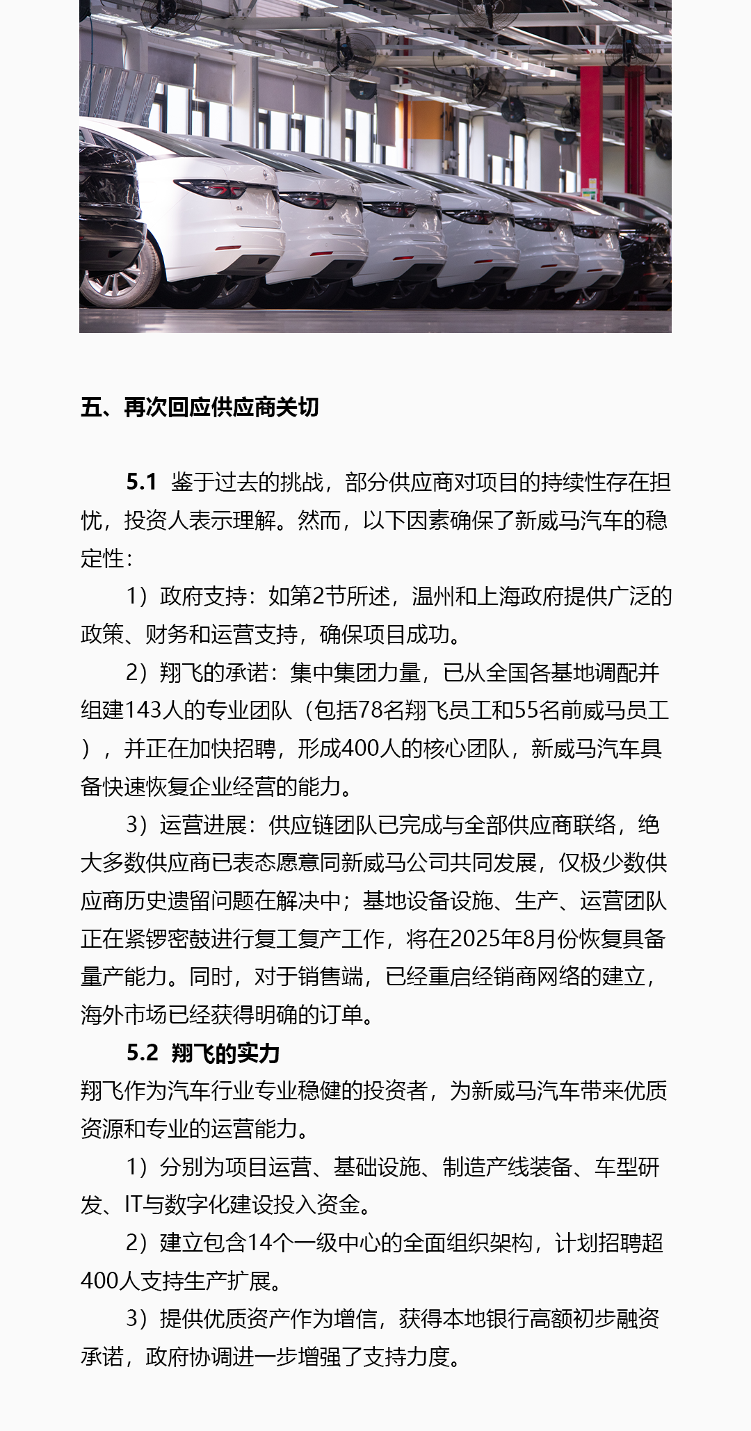 威马汽车重整投资人深圳翔飞汽车销售有限公司(简称“翔飞”)通过威马汽车官微发布《致供应商白皮书》,公布对新威马的相关规划,计划未来5年向市场推出10款以上的新产品,适配全球市场多样化需求。翔飞表示,正在全力以赴推动威马EX5和E5车型在温州基地快速恢复量产,计划到2025年底保底生产1万辆EX5和E5车型,力争2万辆,“预计收入10-20亿元”。根据白皮书,翔飞初期预计投资10亿元用于设备升级供应链恢复和产品开发等。