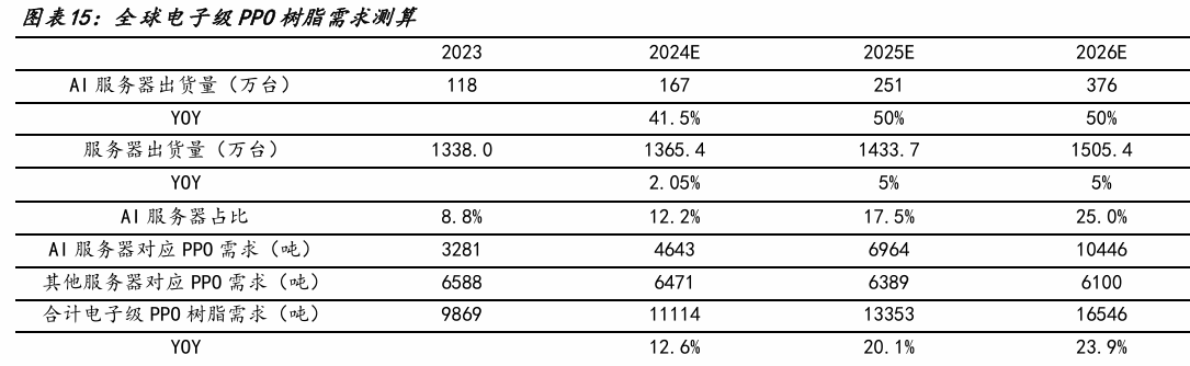从树脂到终端应用需经过覆铜板(CCL)、PCB、设备商多环节认证,周期长达 1-2 年。例如,圣泉集团的电子酚醛树脂进入生益科技供应链耗时 5 年。量产稳定性方面,国外企业如三菱瓦斯的树脂分子量分布指数(PDI)≤1.5,国内企业普遍在 2.0 以上,导致性能波动,需通过分子设计和工艺优化突破。 根据TrendForce的预测,2024年AI服务器的全年出货量约167万台,同比增长41.5%, 未来两年由于AI算力等人工智能方向的投资大大增加,预测AI服务器增速为50%; TrendForce预估2024年全球服务器整机出货量约1365.4万台,年增约2.05%,预测未来 两年服务器出货量增速为5%。由此根据测算得出的单耗数据,全球未来两年AI服务器对 应PPO树脂需求为6964/10446吨,各服务器合计电子级PPO树脂需求为13353/16546吨, 增速较快。 |