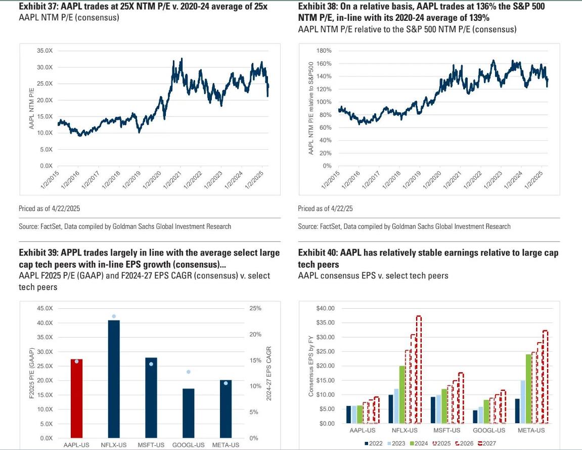 尽管自4月11日美国商务部宣布智能手机和个人电脑享受对等关税豁免以来,市场情绪有所改善(4月4日到4月22日期间苹果股价反弹近8%),但市场普遍认为关税政策不确定性和业绩增长前景的不确定性仍是该股的悬顶之剑。