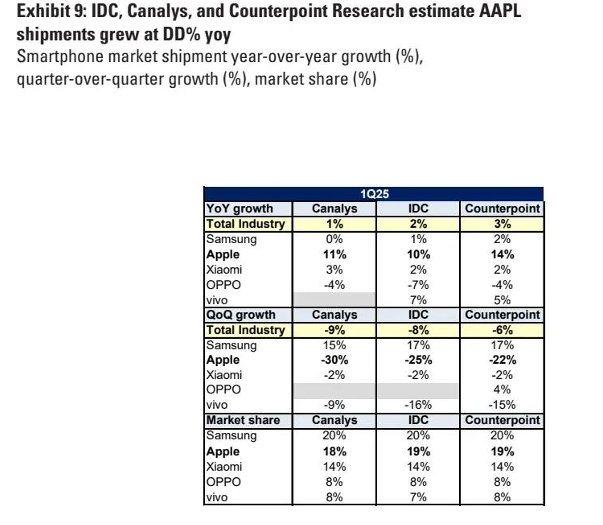 对于苹果业绩贡献力量最大的iPhone营收方面,高盛预计Q2 iPhone业务线的营收约为 478 亿美元(即同比增长 4%),高于华尔街平均预期的 456亿美元。高盛表示,iPhone 营收增长应由销量同比增长10%所驱动,这得益于(1)价格更加亲民且体验感不属于旗舰机型的iPhone 16e 的发布;(2)因美国关税政策的巨大不确定性导致的需求提前集中,以及AI驱动的换机周期。
