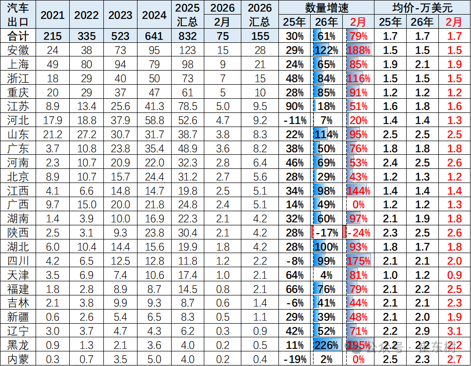 乘联分会秘书长崔东树发布2026年1-2月中国汽车出口市场分析。2025年中国汽车实现出口832万辆,同比2024年全年增速30%。2026年1-2月中国汽车实现出口155万辆,同比2025年同期增速61%,2月中国汽车实现出口75万辆,同比增79%,环比下降7%,同比和环比走势总体较强。2026年2月中国新能源汽车出口32万辆,同比增长120%,1-2月累计出口67万台,增88%的表现很好,新能源车出口表现很强。