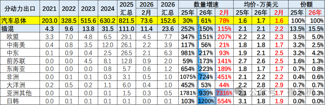 2026年1-2月中国插混车型出口24万辆、增150%,其中2月插混出口11万辆、增115%。除了美加等地区的插混需求下滑较快,其它地区的中国插混表现都很突出。而欧盟地区的中国插混车型需求增长,中东的土耳其等插混出口成为新增长亮点。