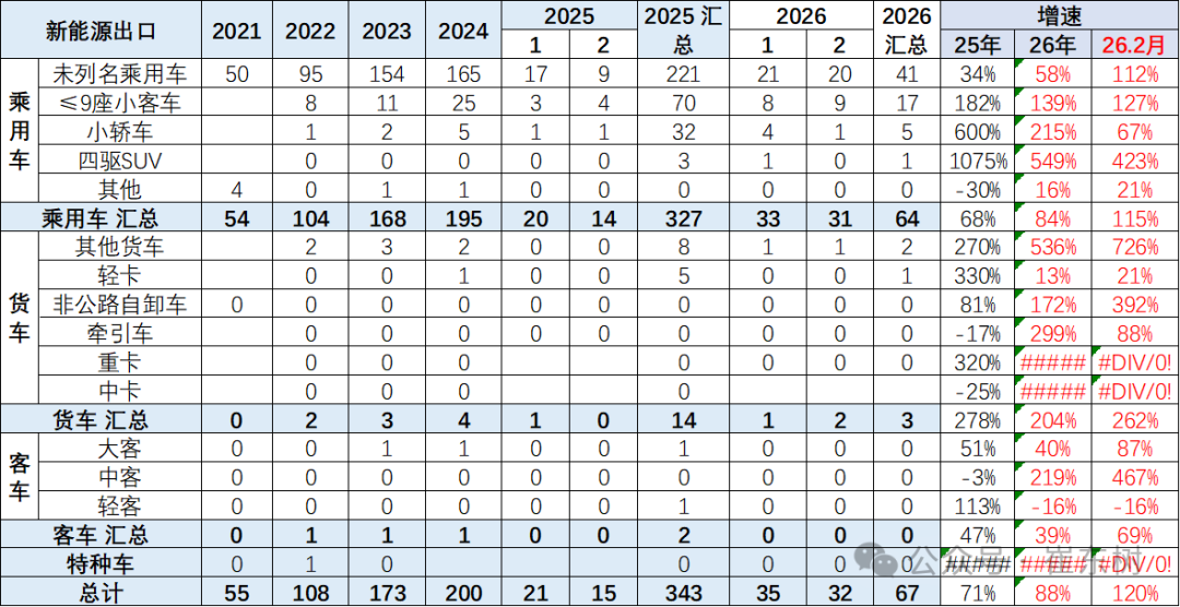 因欧盟加征关税,2024年下半年中国新能源出口走势低迷,市场压力较大。2025年新能源车出口暴增的走势超强。2026年1-2月新能源出口持续历史高位,国内低迷的出口热情更高。