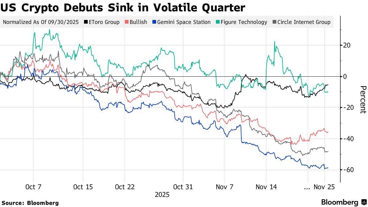10月初开始的加密货币价格暴跌,已使数字资产总市值蒸发超过1万亿美元,但即便在此之前,加密货币IPO的市场反馈也参差不齐。具体而言,9月以28美元发行价上市的加密货币交易所Gemini Space Station(GEMI.US)股价在第三季度已下跌14%。EToro Group(ETOR.US)的股价表现更差,从5月上市到9月30日下跌超过20%。即便是在暴跌前表现稳健的公司也未能幸免。8月上市、由Tom Farley领导的机构型加密交易所Bullish(BLSH.US)自10月初以来股价已回落38%。