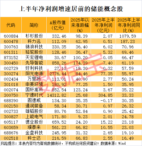 据证券时报·数据宝统计,A股市场储能概念股中,今年上半年净利润同比增长(含扭亏为盈)的有27股,杉杉股份、科力远、锦浪科技、骆驼股份、天宏锂电等净利润增速靠前。