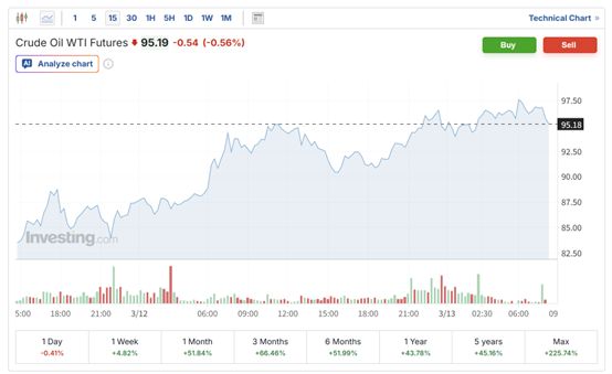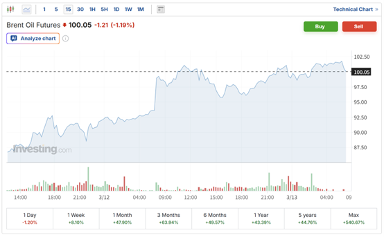 国际油价周四大幅上涨,因霍尔木兹及其附近水域船只持续遭到袭击,且伊朗最高领袖穆杰塔巴·哈梅内伊3月12日在其就任以来的首份声明中誓言将继续封锁霍尔木兹海峡。