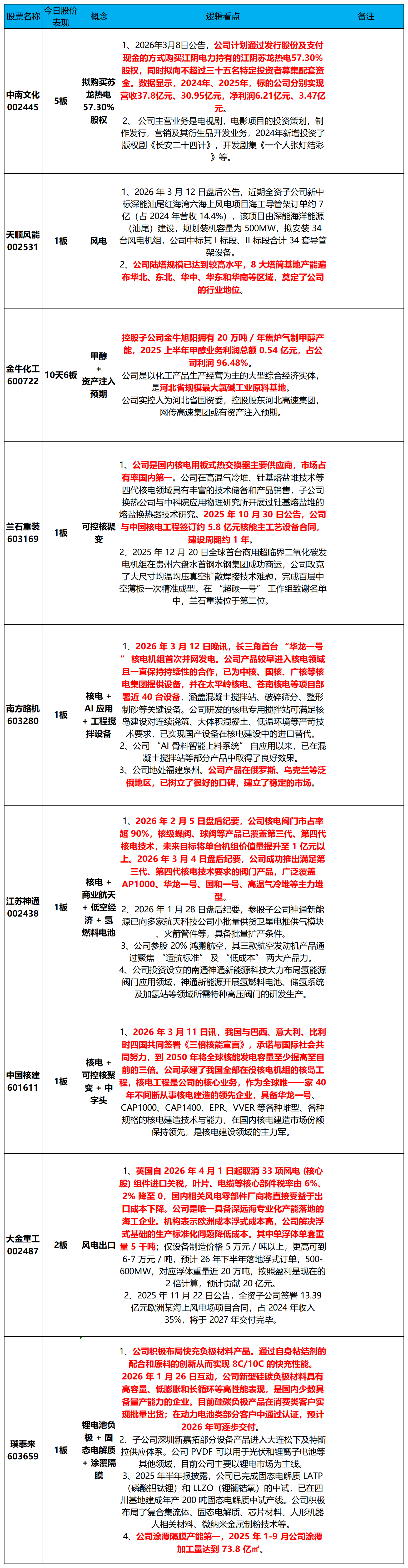 天顺风能002531、兰石重装603169、南方路机603280、江苏神通002438、中国核建601611、璞泰来603659、