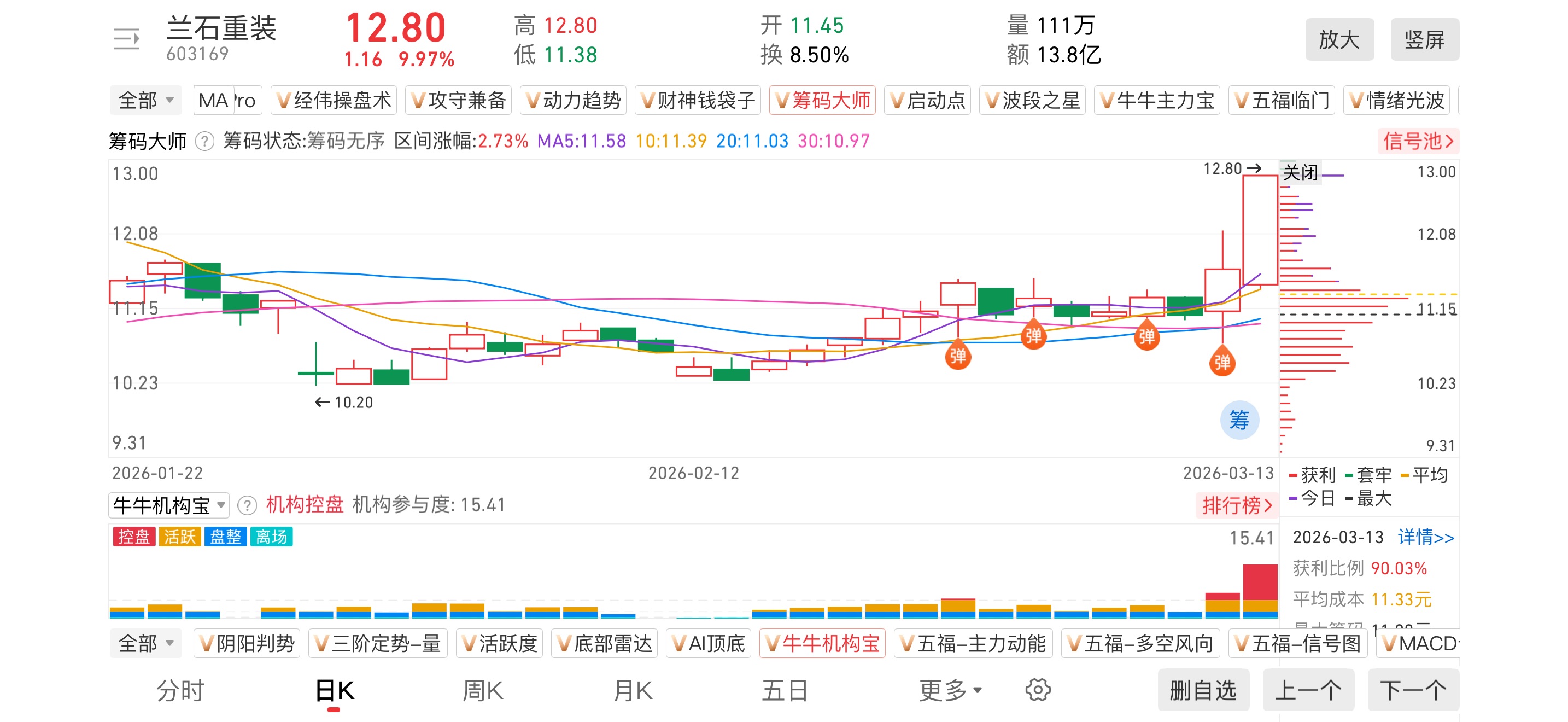 1)20260313-兰石重装-603169-【筹码大师】和【牛牛机构宝】-近期出现弹信号且底部量柱由绿转红