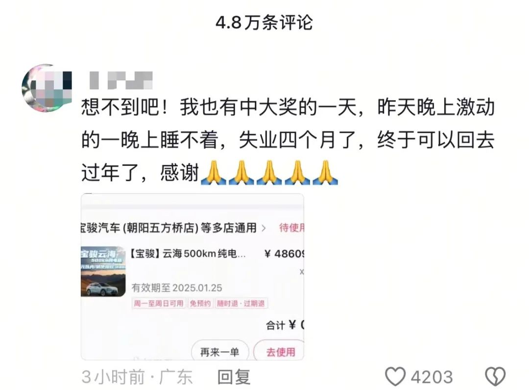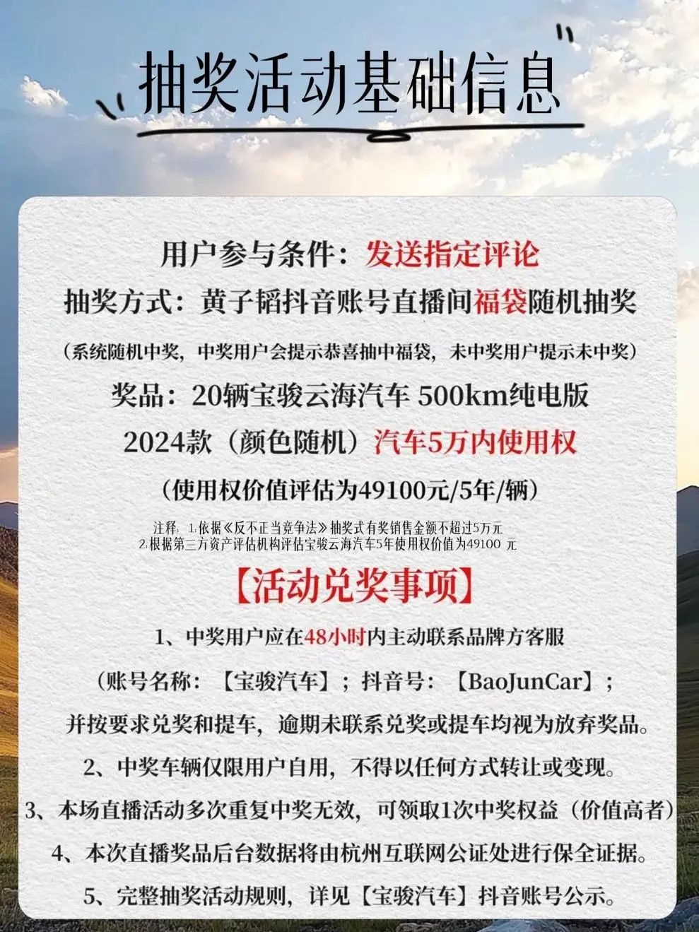 黄子韬社交平台账号的发布的信息显示,本次送出的车为宝骏云海,纯电500km续航款。该车型官方售价在123800元/辆,因为直播抽奖属于有奖销售内容,要求不能超过5万元,所以最终只能送出汽车使用权。