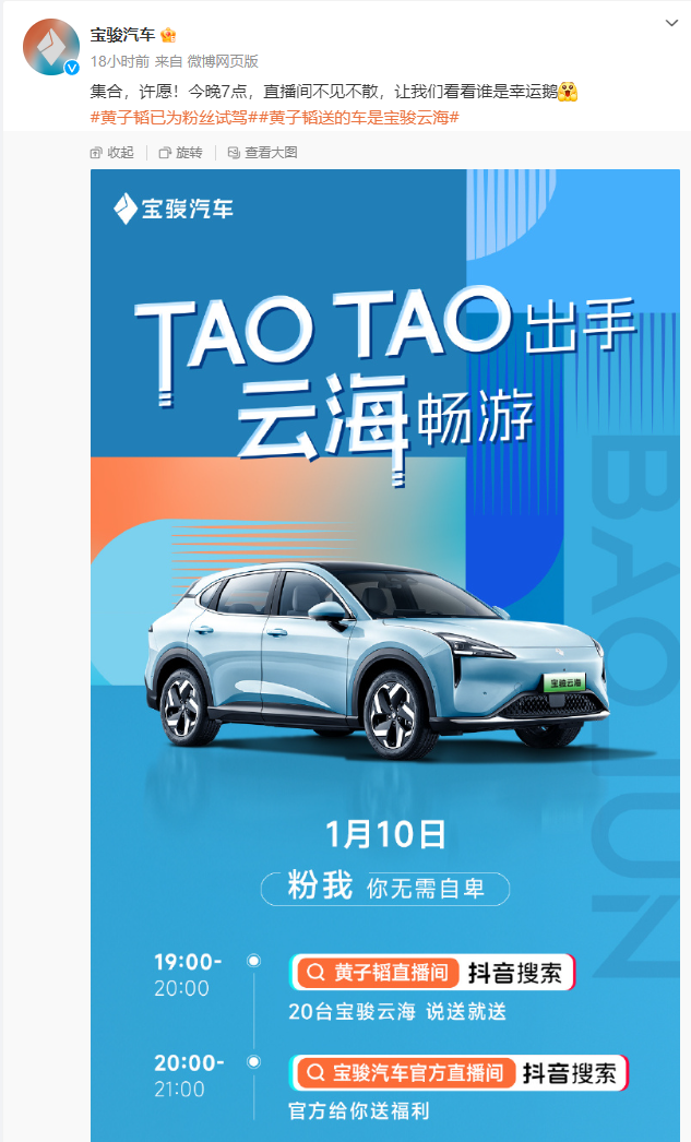 需要注意的是,在本次直播中,黄子韬送出的车型为宝骏云海。在直播前,宝骏汽车也借势推出了几轮宣传预告: