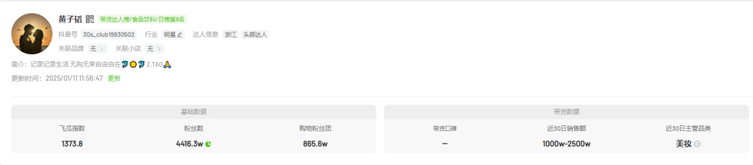 飞瓜数据显示,在最近30日内,黄子韬的直播间带货销售额在1000万—3000万元之间,主营品类为美妆产品。