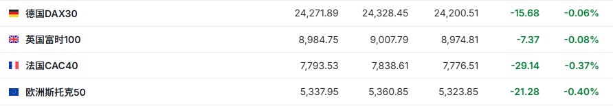 2. 截至发稿,德国DAX指数跌0.06%,英国富时100指数跌0.08%,法国CAC40指数跌0.37%,欧洲斯托克50指数跌0.40%。