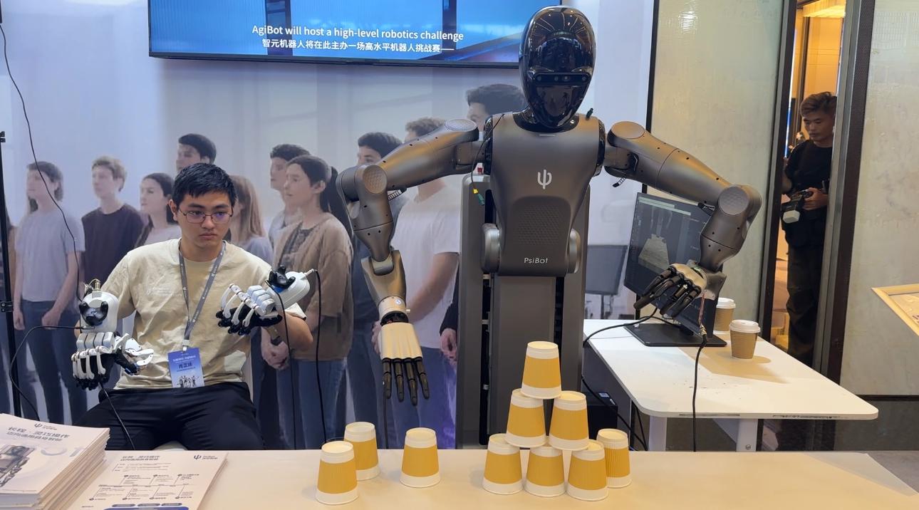 在科研教育展区,记者注意到,智元机器人所投资的初创企业“灵初智能”携带灵巧手、具身智能产品出席活动现场。现场工作人员通过佩戴灵巧手设备,与具身载体实现了动作同步演示。