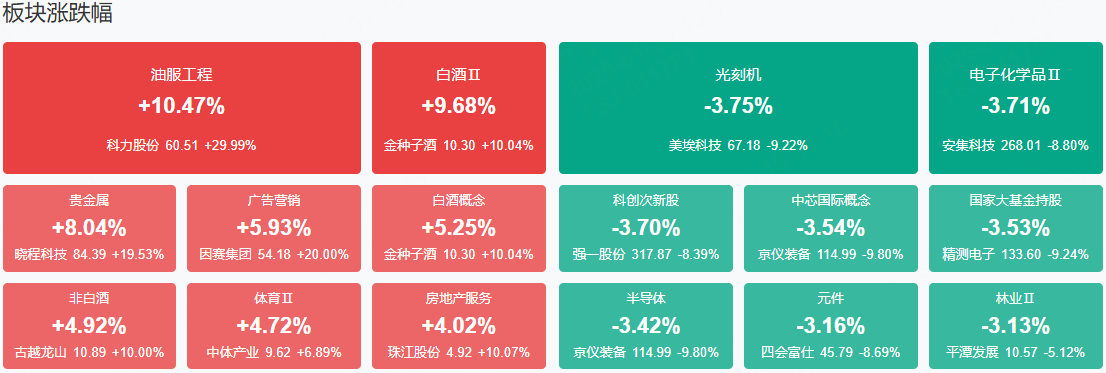 三大指数涨跌不一,沪指窄幅震荡,上证50指数涨超1%,创业板指冲高回落,科创50指数跌超3%。沪深两市成交额3.23万亿,较上一个交易日放量2646亿。盘面上,市场热点快速轮动,全市场超3500只个股下跌。从板块来看,白酒板块午后爆发,泸州老窖、水井坊、舍得酒业、皇台酒业、酒鬼酒涨停。有色金属板块反复活跃,金属铜、贵金属领涨,西部黄金7天4板,中国黄金5连板,北方铜业2连板创历史新高。油气股延续强势,洲际油气7天5板,准油股份2连板,中曼石油4天3板。房地产板块震荡反弹,大悦城、三湘印象、我爱我家涨停。下跌方面,芯片产业链下挫,美埃科技、京仪装备跌超9%。