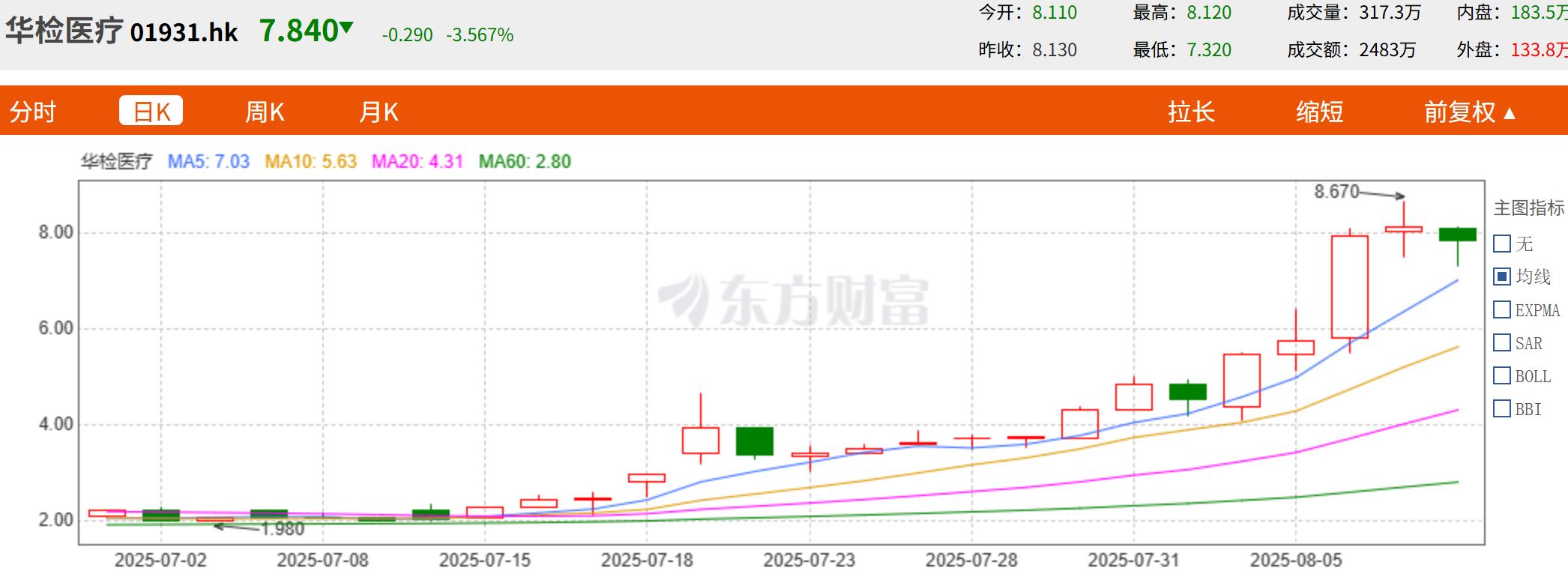 作为全球最大的以太坊金库持有者,Bitmine Immersion Technologies (BMNR)的市值表现同样值得关注。截至8月8日,BMNR实现24.59%涨幅,收报51.43美元/股,市值53.08亿美元。这一数据不仅展示了市场对以太坊金库型上市公司的认可,也为华检医疗的市值增长提供了有力参照。