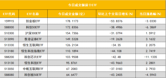 从成交额前十的ETF来看,创业板ETF(159915)成交额位居首位,科创50ETF(58800)成交额位居第二位。