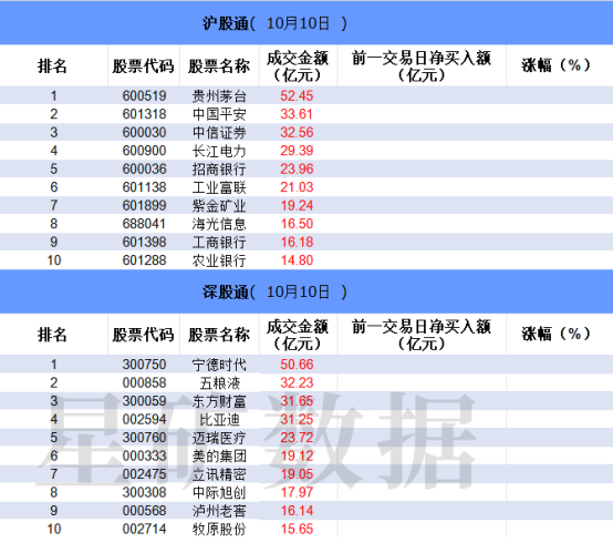 从沪股通前十大成交个股来看,贵州茅台位居首位,成交金额超50亿;中国平安和中信证券分居二、三位。