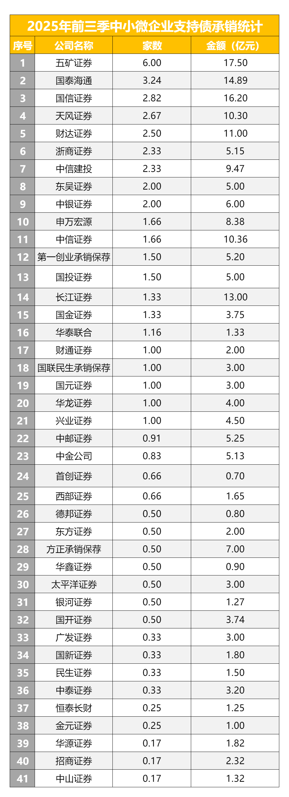 中小微企业支持债券自2023年10月由上交所推出后,市场实践迅速启动:首单债券于同年年底由湖州市产业投资发展集团有限公司成功发行。经过一年多发展,该品种已形成相当规模,截至2025年前三季度,共有41家证券公司担任主承销商,累计承销50只债券,合计金额达207.7亿元。