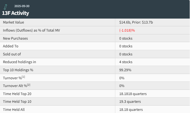 对冲基金大佬比尔·阿克曼旗下的潘兴广场资本管理公司公布了截至2025年9月30日的第三季度持仓报告(13F)。统计数据显示,潘兴广场第三季度持仓总市值为146亿美元,上一季度总市值为137亿美元,环比增长6.6%。潘兴广场在第三季度的持仓组合中,没有新增、增持个股,同样也没有清仓个股,减持了4只个股。其中,前十大持仓标的占总市值的99.29%。