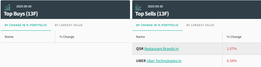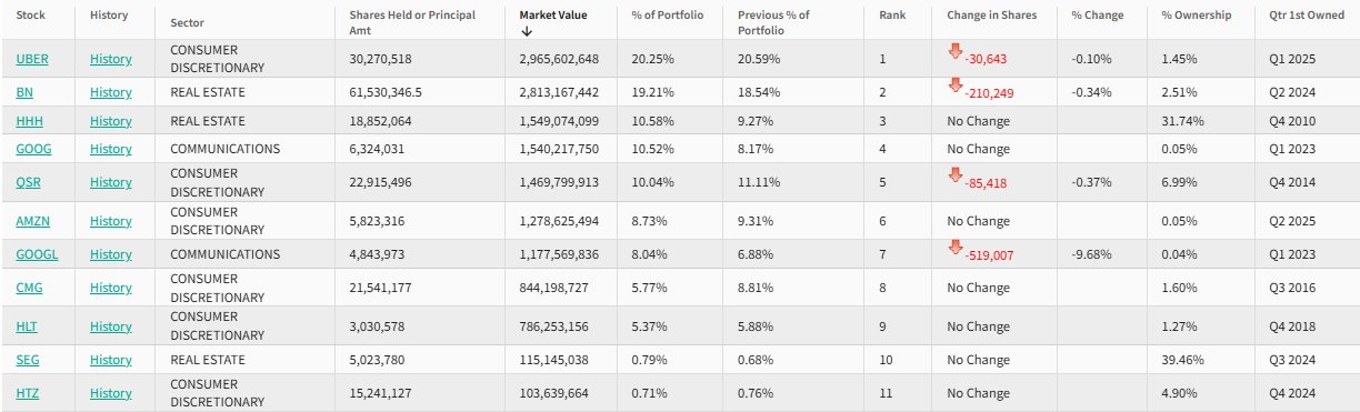 在前五大重仓股中,优步(UBER.US)、Brookfield(BN.US)与Howard Hughes Holding(HHH.US)仍位列持仓股前三位,按持仓市值计算,占其投资者组合比例达50%。而餐饮品牌国际(QSR.US)因遭到减持而从二季度的第四位下滑至第五位,持仓数量环比下降0.37%。