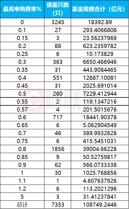 据choice统计数据,截至发稿日,市面上共存续7353只债基(分份额,下同),合计规模10.87万亿。其中,共3621只债基的申购费率上限超过了0.3%,合计规模8.28万亿;有1387只债基销售服务费率超过0.2%,合计规模3565.88亿元,有451只货币基金销售服务费超过0.15%,合计规模9.28万亿;还有1131只债券基金的最高赎回费率低于1.5%,合计规模1.14万亿。