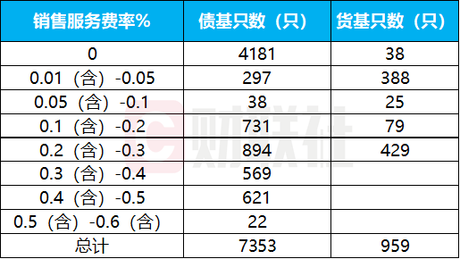 货基收取的销售服务费率中,有451只产品超过0.15%,合计规模9.28万亿,这部分货基是未来整改的核心;有508只产品未超过0.15%,其中,26只货基的销售服务费率为0.15%,38只货基不收取销售服务费。债基和货基收取的销售服务费率如下图所示: