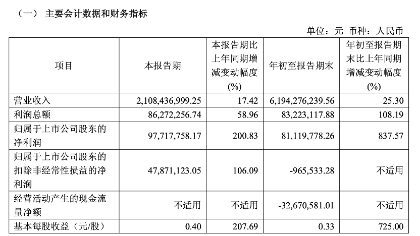 其中,该公司今年第三季度实现营业收入21.08亿元,同比增长17.42%;归属于上市公司股东的净利润为9771.78万元,同比增长200.83%。