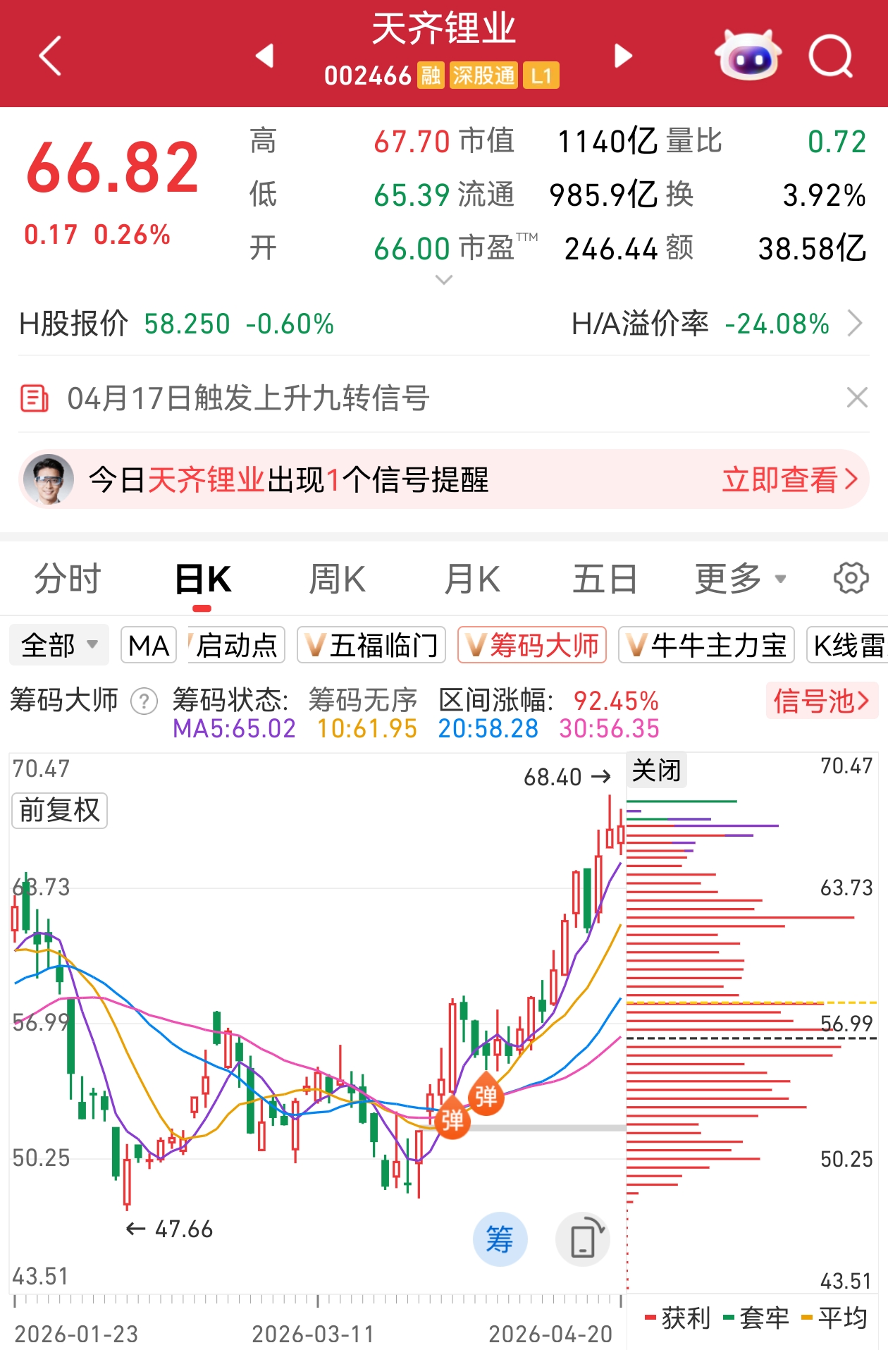 小九注:公司预计2026年第一季度归属于上市公司股东的净利润为17亿元-20亿元,比上年同期增长1530.31%-1818.01%。业绩变动原因:受益于新能源产业发展与下游需求增长,主要锂产品销售均价明显增长;联营公司SQM业绩预计同比大幅增长,公司确认的投资收益较上年同期大幅增长。公司Q1净利润预计17.0亿-20.0亿,2025年Q4净利润2.83亿,据此计算,Q1净利润预计环比增长501%-607%。