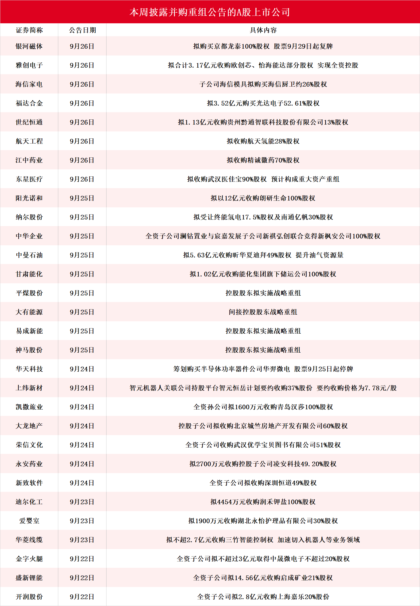 据不完全统计,截至发稿,本周披露并购重组进展的A股上市公司共有30家,包括银河磁体、雅创电子、海信家电、福达合金、世纪恒通、航天工程、江中药业、东星医疗、阳光诺和、纳尔股份、中华企业、中曼石油、甘肃能化、平煤股份、大有能源、易成新能、神马股份、华天科技、上纬新材、凯撒旅业、大龙地产、荣信文化、永安药业、新致软件、迪尔化工、爱婴室、华菱线缆、金字火腿、盛新锂能和开润股份,具体情况如下图: