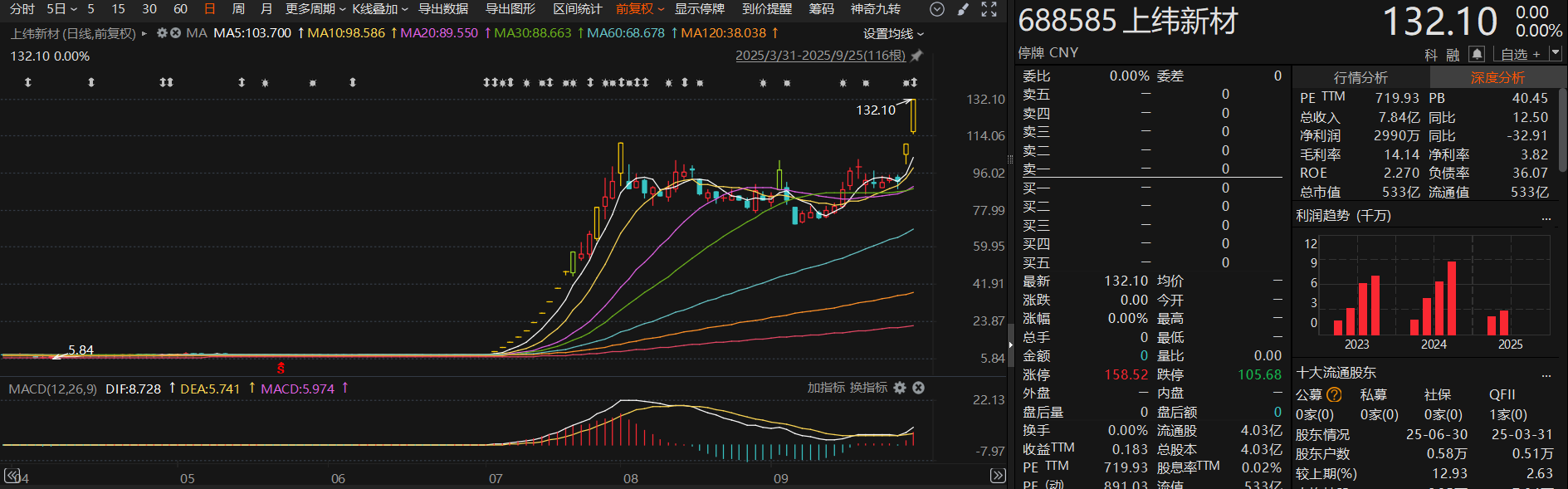 值得注意的是,上纬新材周四晚间公告,公司股票自2025年7月9日至9月25日期间多次触及股票交易异常波动及严重异常波动情形,最近两个交易日连续涨停。公司股票将于9月26日开市起停牌,自披露核查公告后复牌。上纬新材曾于7月30日盘后公告,多次触及股票交易异常波动和严重异常波动情形,7月31日起停牌核查。公司股票于8月5日开市起复牌,复牌当天收盘20CM涨停。
