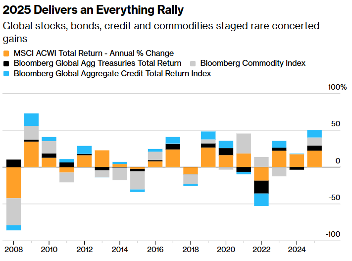 从全球股票、债券、信贷和大宗商品来看,2025 年的跨资产表现是自 2009 年以来最强劲的——而 2009 年的特点是估值达到危机水平,并且政府采取了广泛的政策干预措施。